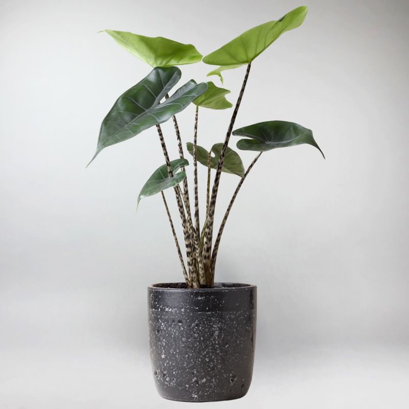 Die Alocasia Black Zebrina, die wir auch Schwarze Zebrina nennen, besticht durch ihre tiefen, fast schwarzen Stängel und großen, glänzenden Blätter mit markanten Blattadern. Sie ist ein sofortiger Blickfang in Wohnzimmern und Ateliers. Sie verleiht jedem Raum eine schicke Ausstrahlung und ist dabei überraschend anpassungsfähig an das Leben in Innenräumen.