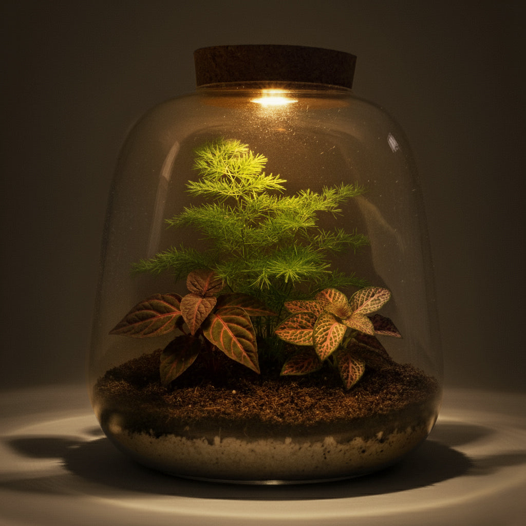 Die Pflege eines Terrariums ist recht einfach. Halten Sie das Substrat leicht feucht, aber nicht nass (testen Sie dies, indem Sie die obersten 1–2 cm fühlen). Besprühen Sie das Terrarium alle 2–5 Tage, um die Luftfeuchtigkeit zu erhalten, bei trockener, warmer Raumluft häufiger. Verwenden Sie ein durchlässiges, humusreiches Substrat mit einer Schicht Kieselsteinen oder Aktivkohle für optimale Drainage und Geruchskontrolle. Stutzen Sie die Triebspitzen von Spargelpflanzen und stutzen Sie die Spitzen von Hypoestes, um ein buschiges Wachstum zu fördern; entfernen Sie vergilbte Blätter umgehend. Düngen Sie sparsam: einmal monatlich während der Wachstumsphase mit einem verdünnten Flüssigdünger (auf ein Viertel der empfohlenen Konzentration). Sicherheit für Haustiere: Hypoestes und Hemigraphis gelten im Allgemeinen als wenig giftig, dennoch sollten Terrarien außerhalb der Reichweite von Haustieren und Kindern aufbewahrt werden.