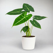 Die Alocasia Frydek (Grüne Samtpflanze) besticht durch ihre eleganten, pfeilförmigen Blätter mit samtweicher Oberfläche und leuchtend weißen Adern. Sie ist eine imposante Blickfangpflanze, die Wärme und Feuchtigkeit liebt. Stellen Sie sie an einen hellen, aber nicht direkt besonnten Standort und gießen Sie sie, sobald die oberste Erdschicht trocken ist. Mit einem gut durchlässigen Substrat und gleichmäßigen Bedingungen belohnt sie Sie mit üppigem, architektonisch anmutendem Laub.