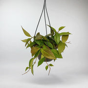 Die Hoya Sunrise, eine Kreuzung aus Hoya lacunosa und Hoya obscura, ist eine leuchtende Sukkulente mit tropfenförmigen Blättern in Grün- bis Rosatönen. Diese elegante Epiphytenpflanze verleiht jedem Raum einen Hauch von Sonnenuntergangswärme. Einfach hängen lassen und sich entfalten lassen (tut uns leid).