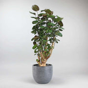 Die Aralia Fabian ist ein schöner kleiner Baum mit kreisförmigen Blättern in tiefem Grün und Kastanienbraun. Wegen ihres gefälligen, gleichmäßigen Blattwerks wird diese Pflanze manchmal auch "Essteller-Aralie" genannt. Laut Feng Shui bringt die Fiederaralie Fabian warme, positive Energie - etwas, das uns allen in diesen seltsamen Zeiten gut tun könnte. Wir haben sie mit dem strukturierten und blau-silbern glasierten Stitch Pot kombiniert.
