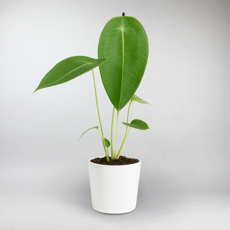 Anthurium peltigerum ist eine seltene Art mit länglichen, schildförmigen Blättern und einer markanten, skulpturalen Erscheinung. Ihr Laub färbt sich dunkelgrün mit feiner Aderung und verleiht ihr ein edles, tropisches Aussehen. Sie benötigt einen warmen Standort mit hoher Luftfeuchtigkeit und hellem, indirektem Licht. Gießen Sie erst, wenn die obersten Zentimeter der Erde trocken sind, und verwenden Sie ein lockeres, rindenreiches Substrat.